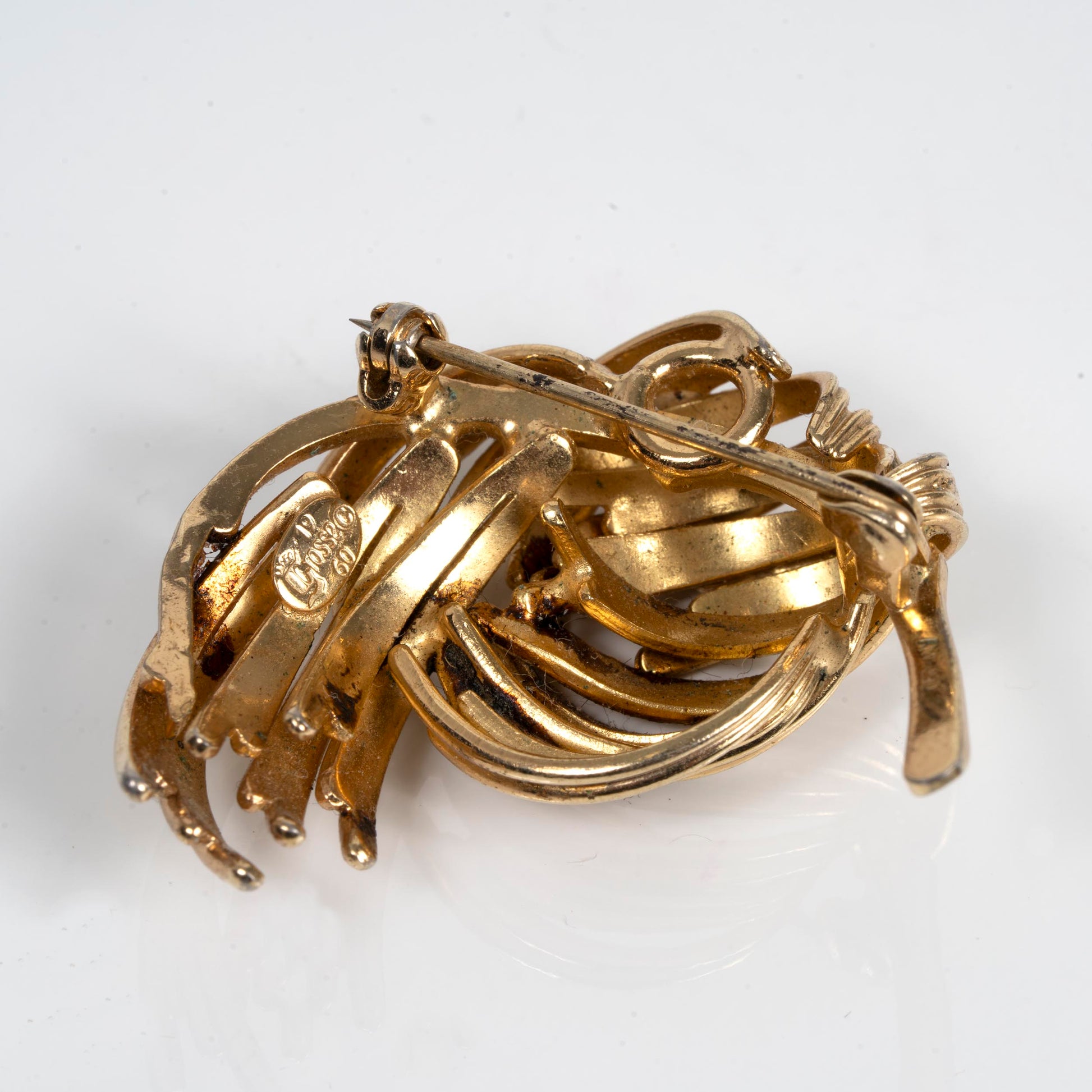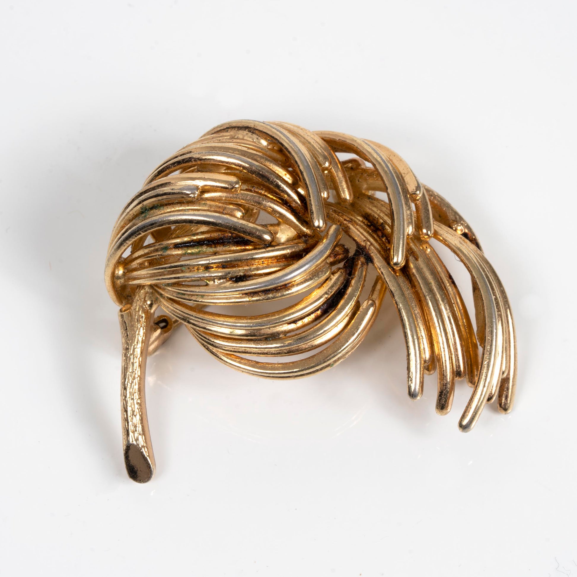 Ta rzeźbiarska i zdecydowanie nowoczesna broszka z pozłacanego metalu uosabia kreatywną śmiałość lat 60. XX wieku. Zaprojektowana przez firmę Grosse, znaną ze współpracy z Christianem Diorem, przedstawia abstrakcyjny motyw splecionych zawijasów, przywodzący na myśl stylizowany węzeł lub arabeskę w ruchu. Metal, wyrzeźbiony w reliefie i o delikatnej fakturze, odbija światło, podkreślając wirtuozerię projektu.