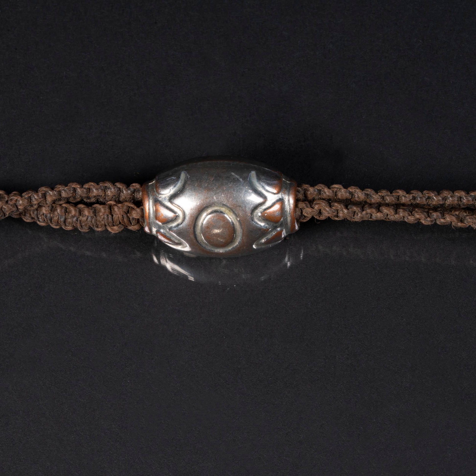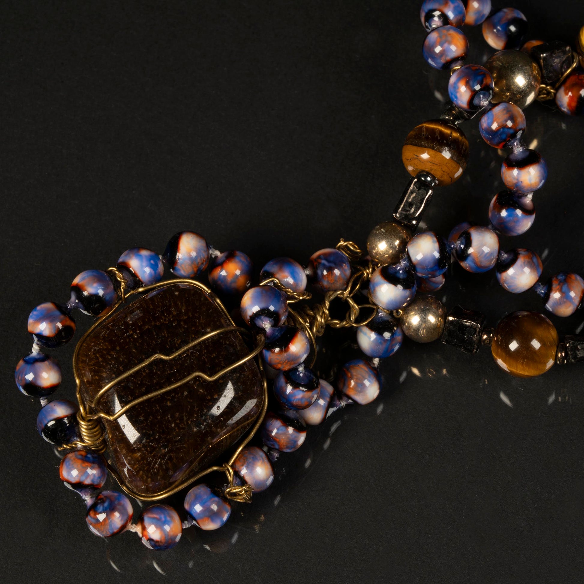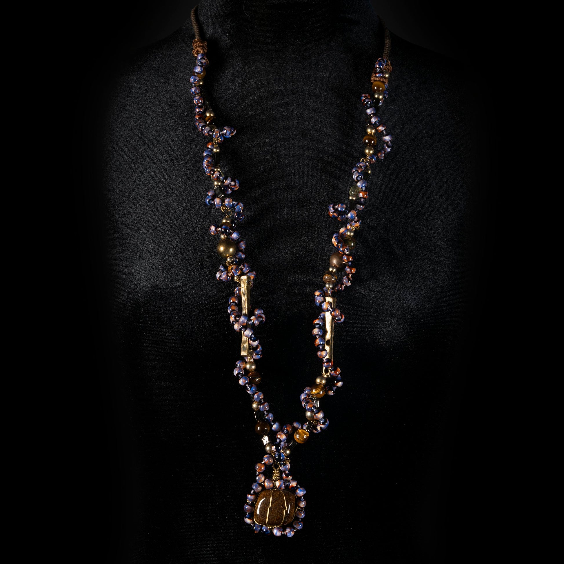 Jego brązowy, pleciony bawełniany sznur zdobi spiralny łańcuszek z wielobarwnych szklanych koralików, przeplatanych złotymi kulkami i wydłużonymi elementami o szlachetnym blasku. W centrum naszyjnika znajduje się zawieszka z polerowanego oka tygrysa, oprawiona w złotą metalową ramkę, która intensywnie odbija światło.